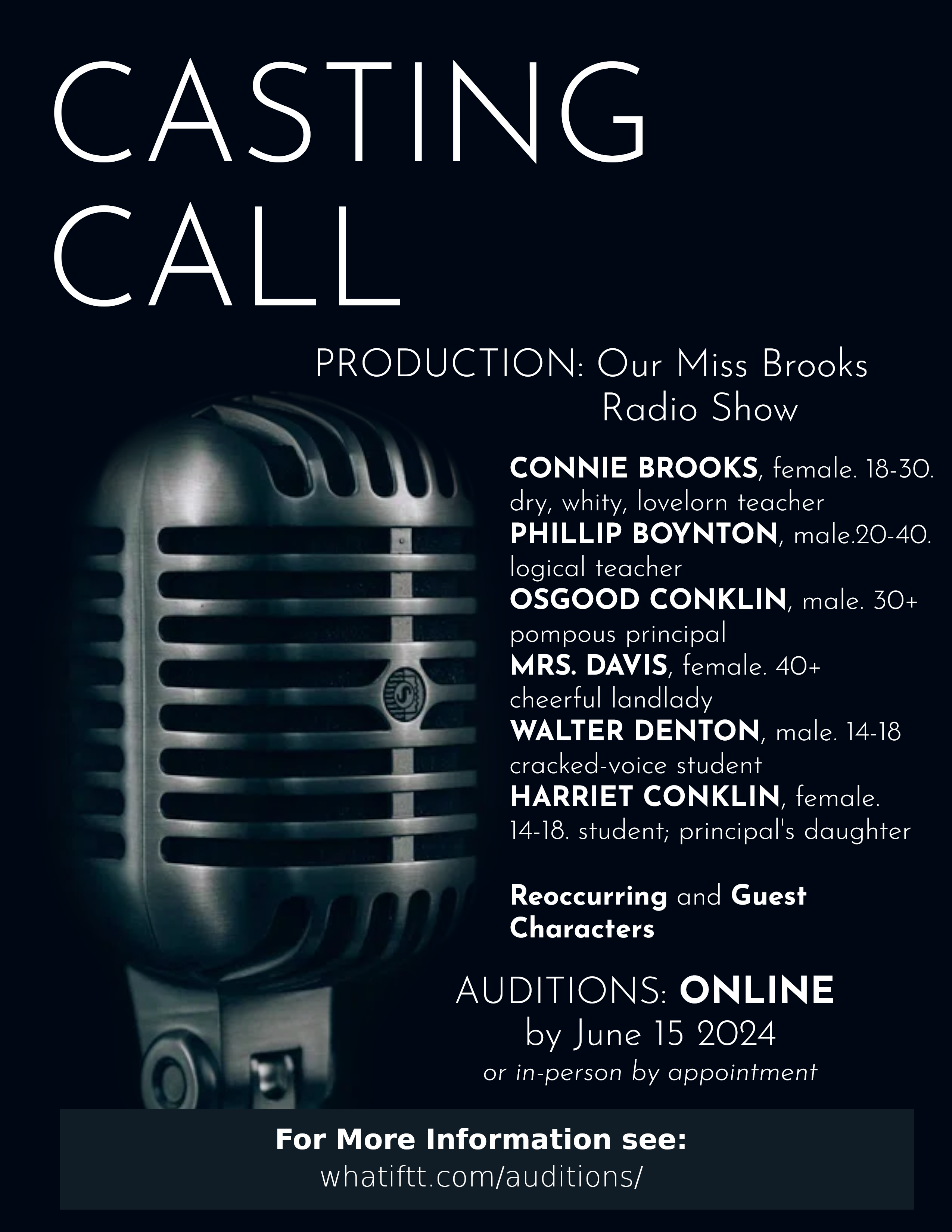 ![]() | We’re looking for new members for our latest project: Our Miss Brooks. Actors/Actresses are encouraged to portrait the characters using the prompts but are able to take liberties where warranted. This means that while the character could be a young male, the voice actor/actress does not need to be. To access the script and additional resources you may find useful, see AUDITION RESOURCES. To submit an audition online, please use this SUBMISSION FORM. To audition in-person, please CONTACT US. |